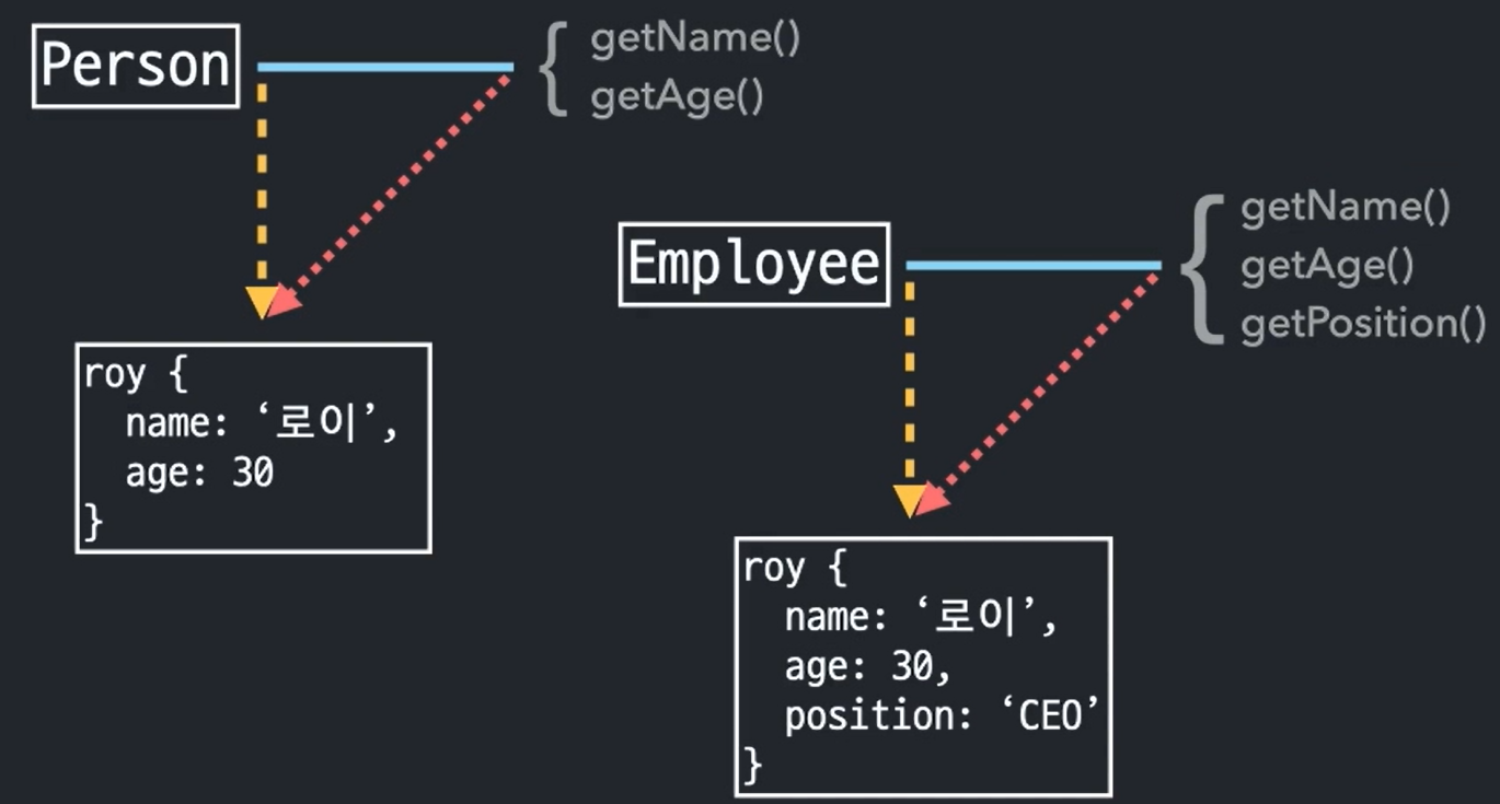 을 통해 둘을 연결하여 사용할 수 있다, Employee 의 프로토 타입에 Person 의 인스턴스를 할당하는 것이다