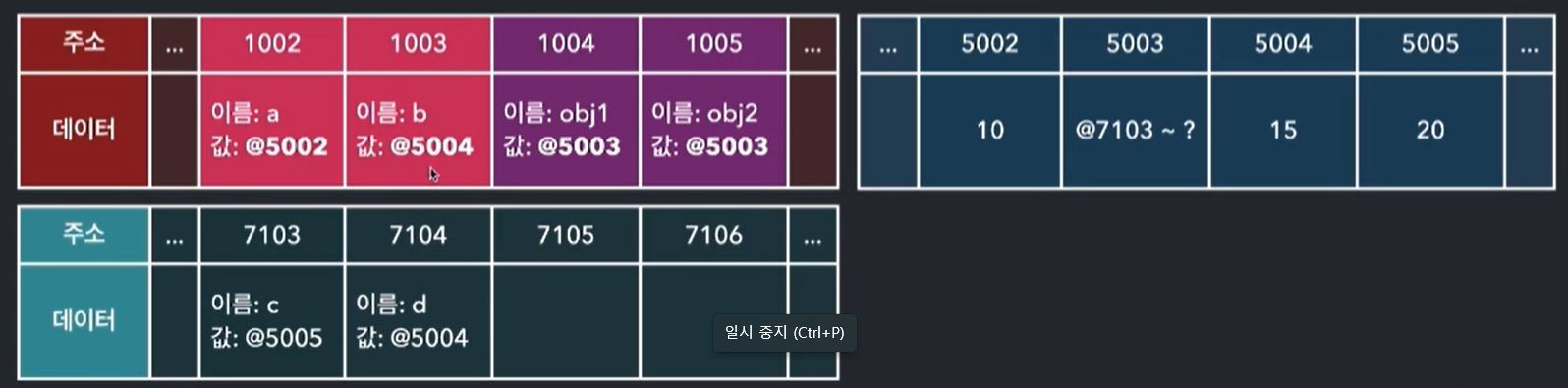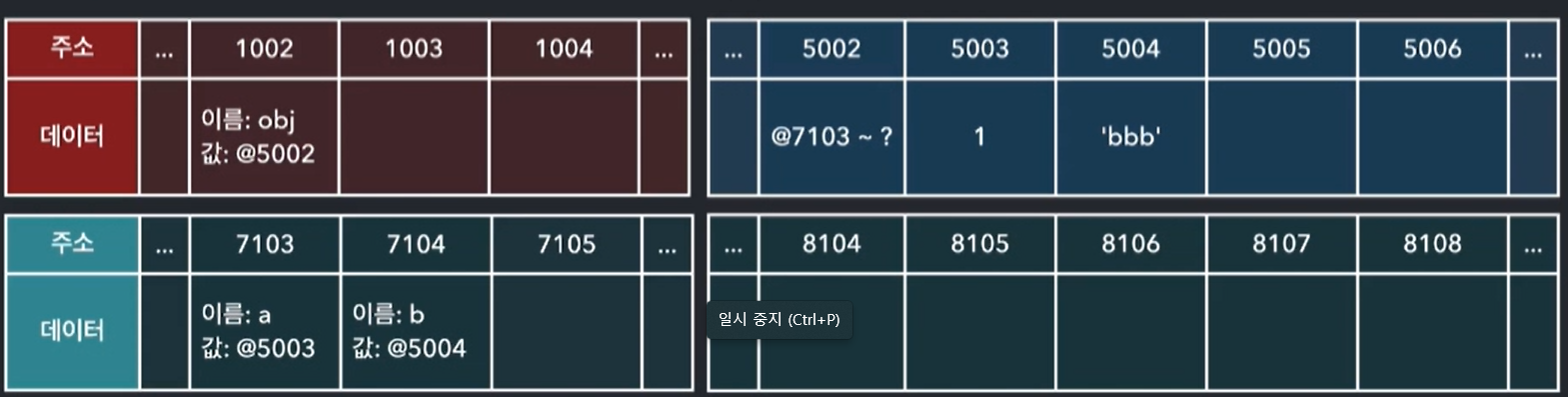 : 변수 = 데이터 를 설정할 때 메모리에 올리게 되는데 순서는 다음과 같다 var a; // 변수 a 를 임의의 메모리에 올린다 (주소를 1 이라고 하자) // 주소 1 에 이름과 값을 저장할 수 있는데, 이름은 a 로 저장한다 a = 'abc'; // 값 'abc' 를 임의의 메모리에 올린다 (주소를 2라고 한다) // 주소 1 의 값을 주소 2로 저장한다 a = 'abcde'; // 값 'abcde' 를 임의의 메모리에 올린다 (주소 3 이라고 한다)\ // 주소 1의 값을 주소 3 으로 저장한다
