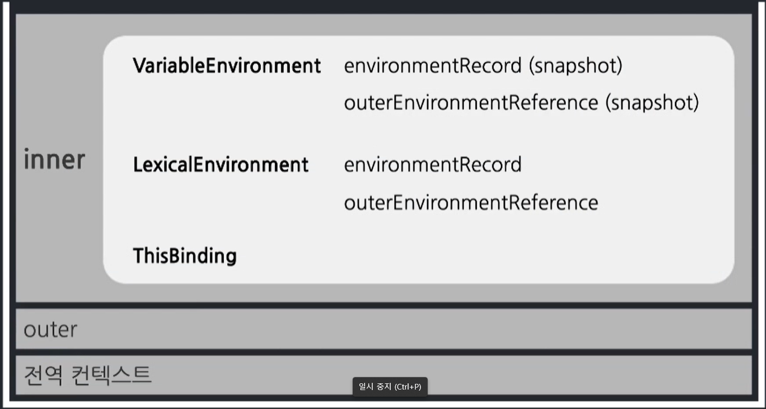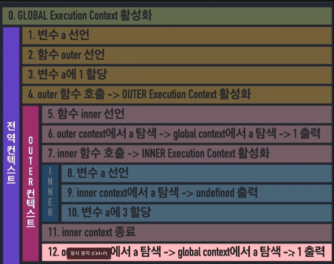 흐름 : 전역 컨텍스트 -> outer() 호출 -> outer 컨텍스트 -> inner() 호출 -> inner 컨텍스