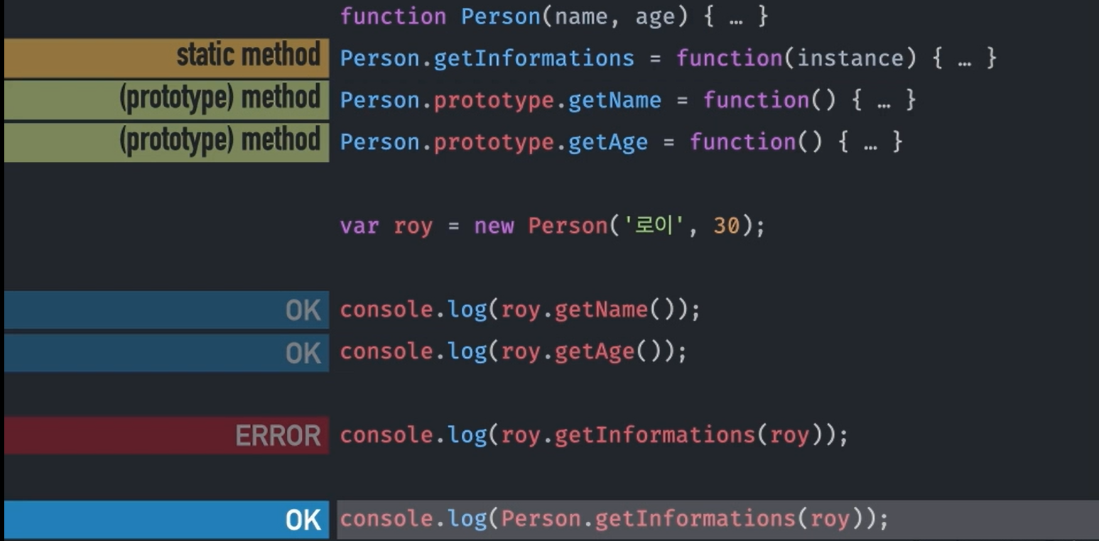 console.log( roy.getInformations(roy) ); 는 new 키워드를 통해 생성된 변수 roy 로 스태틱 메서드에 접근하였기 때문에 에러가 발생한다