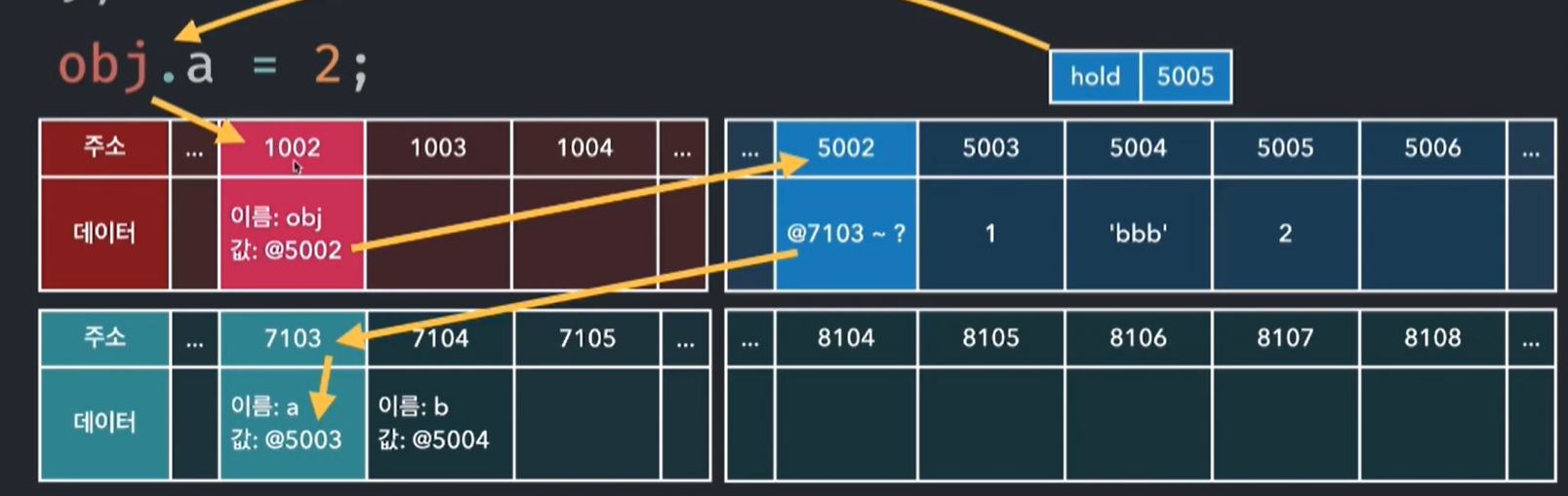 7103, 7104 의 메모리에 프로퍼티를 할당하여 참조할 수 있도록 한다